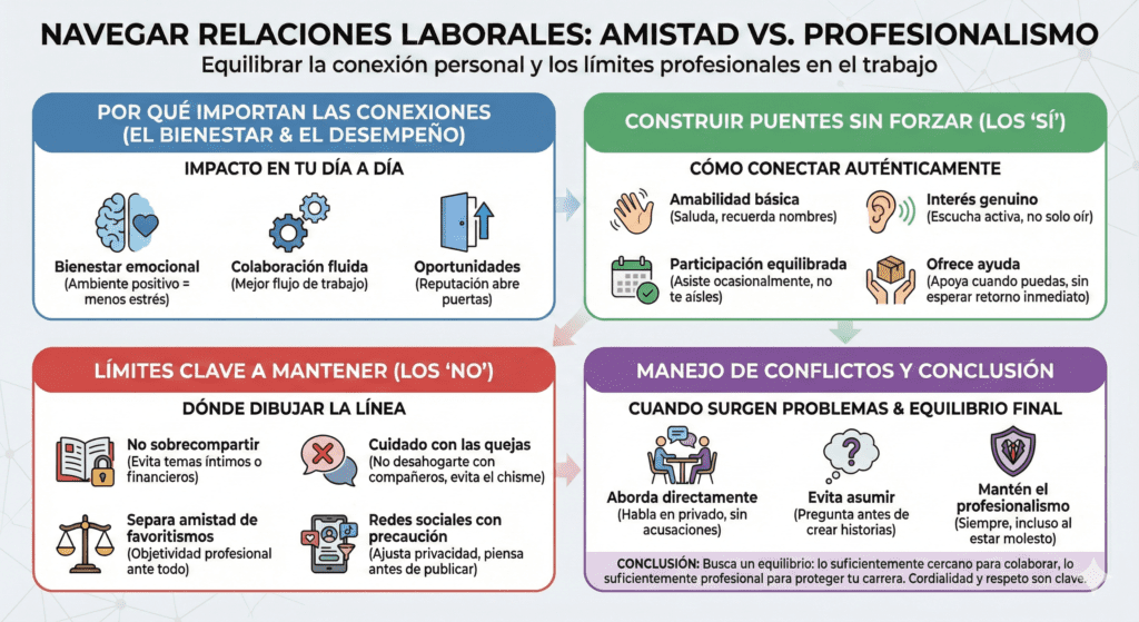 Pasas más tiempo con tus compañeros de trabajo que con tu familia. Pero construir relaciones laborales sanas es un equilibrio delicado entre ser amigable y mantener límites profesionales. Aquí te explico cómo lograrlo sin complicaciones.