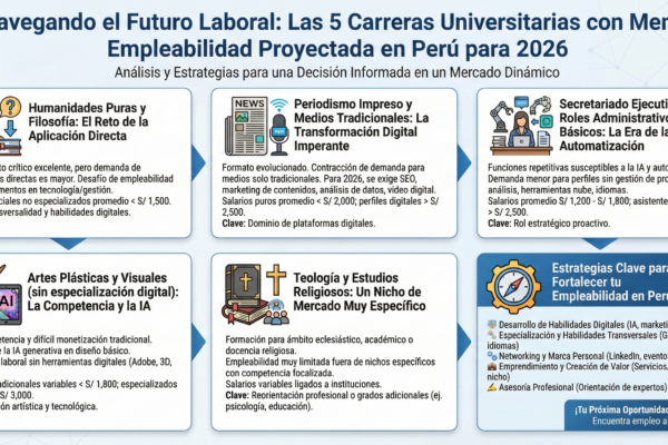 Identifica las 5 carreras universitarias con baja empleabilidad en Perú para 2026. Este análisis práctico te ofrece datos clave y estrategias para potenciar tu perfil...
